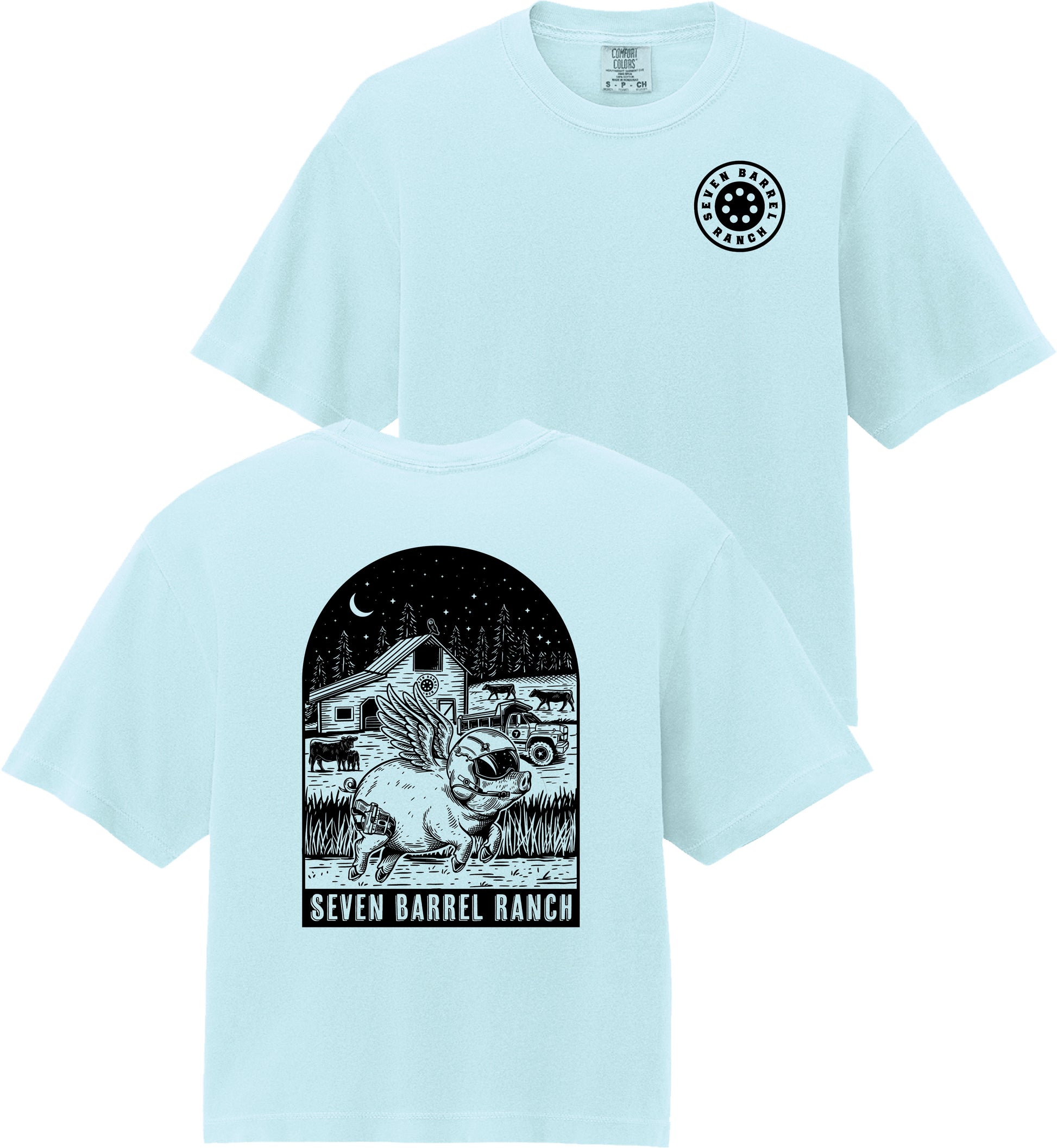 Introducing the first Woman's World Famous Flying CowPig T-Shirt, crafted using the Comfort Colors 3023L Heavyweight Women's Boxy T-Shirt as our standard. 100% Ring Spun US Cotton. Known for its comfort and durability, this tee brings the rugged, authentic feel of the ranch to your wardrobe. With its soft-washed, garment-dyed fabric, this casual classic carries the trademark attention to detail that we’ve built our reputation on at 7 Barrel Ranch.